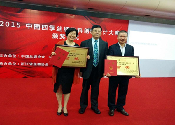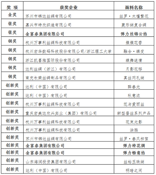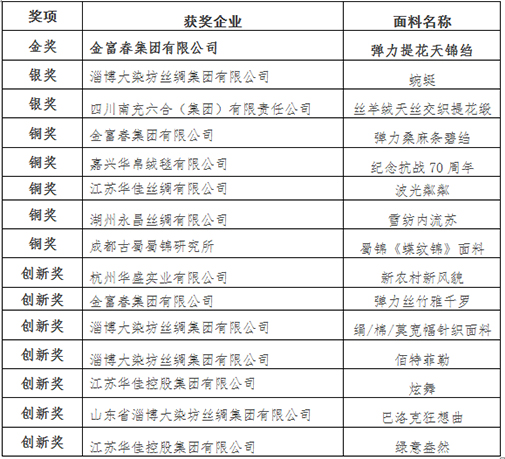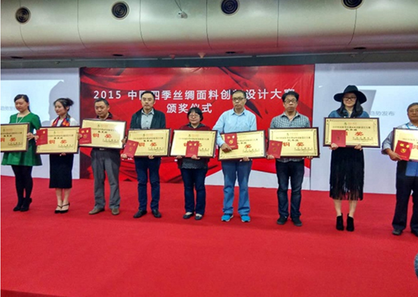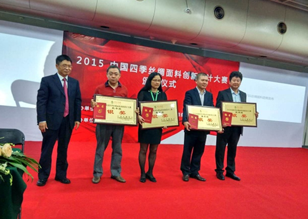 2015年10月24日,由中國絲綢協會與中國國際絲綢博覽會組委會發起 開展的“2015中國四季絲綢面料創新設計大賽”評選結果在浙江世貿國際展覽中心揭曉。 本次大賽以“現代時尚、絲享生活”為主題,組委會共收到18家企業70份作品,其中春夏 面料產品42份,秋冬面料產品28份。大賽組委會本著“公平、公開、公正”的原則,組織 蘇州大學、浙江理工大學等高校教授及行業專家對參賽作品的設計創意、造型結構、面料 材質、工藝手法、色彩搭配分別進行打分,并按照得分從高到低順序確定獲獎企業名單。 最終來自蘇州市錦達絲綢有限公司參賽的“絲羅?木槿繁花”面料、金富春集團有限公司參 賽的“彈力提花天錦縐”面料脫穎而出,分別獲得大賽春夏面料組和秋冬面料組金獎;嘉 興市特欣織造有限公司、淄博大染坊絲綢集團有限公司等四家企業獲得大賽銀獎,其余獎 項詳見附件。